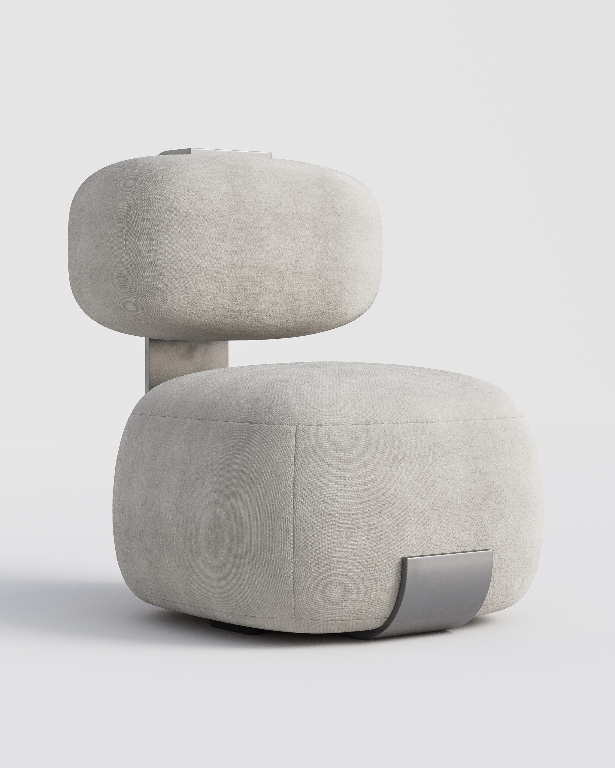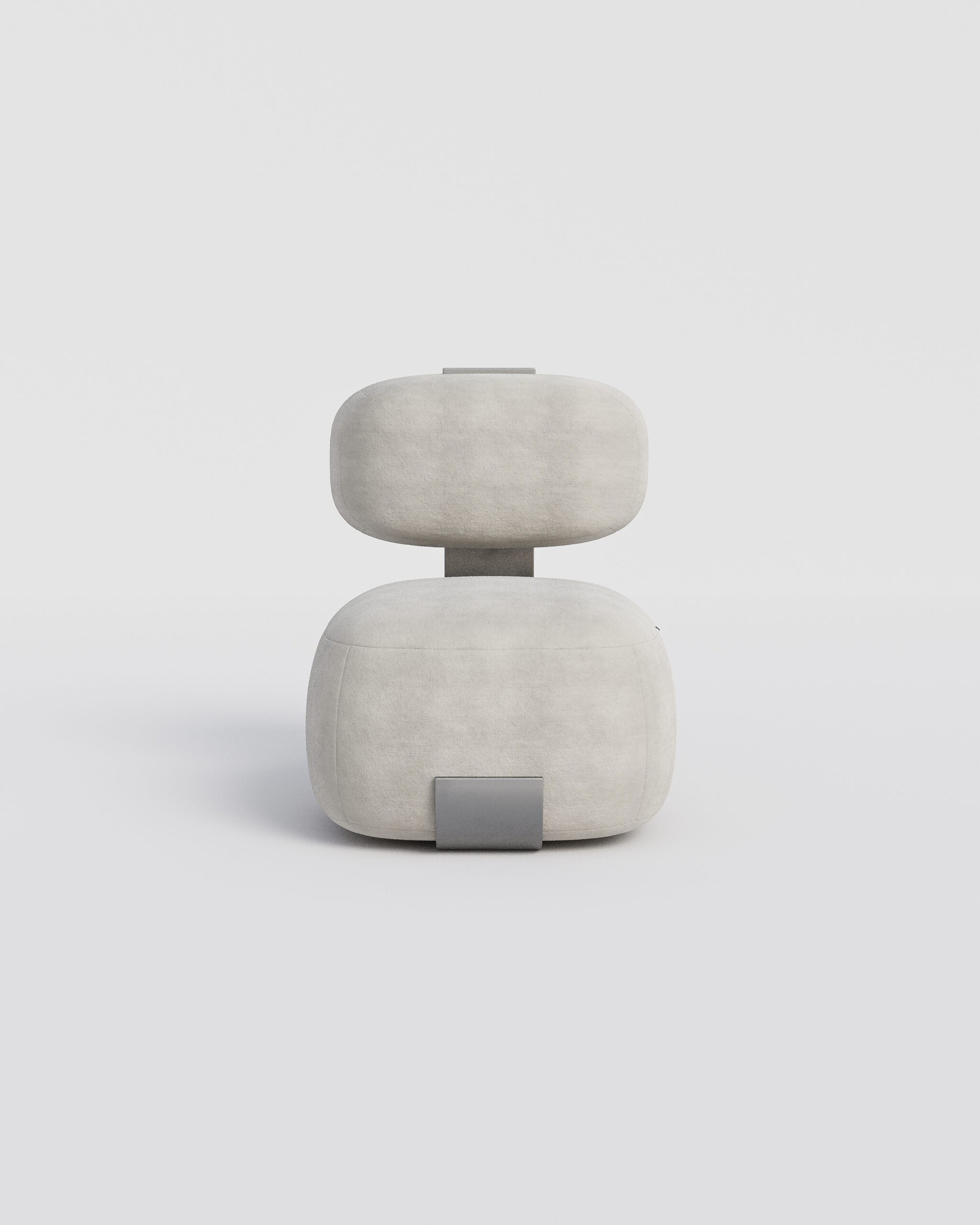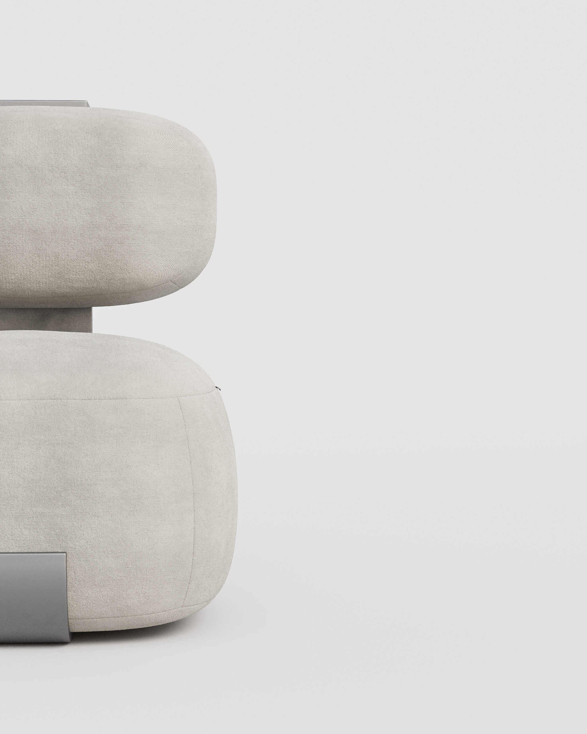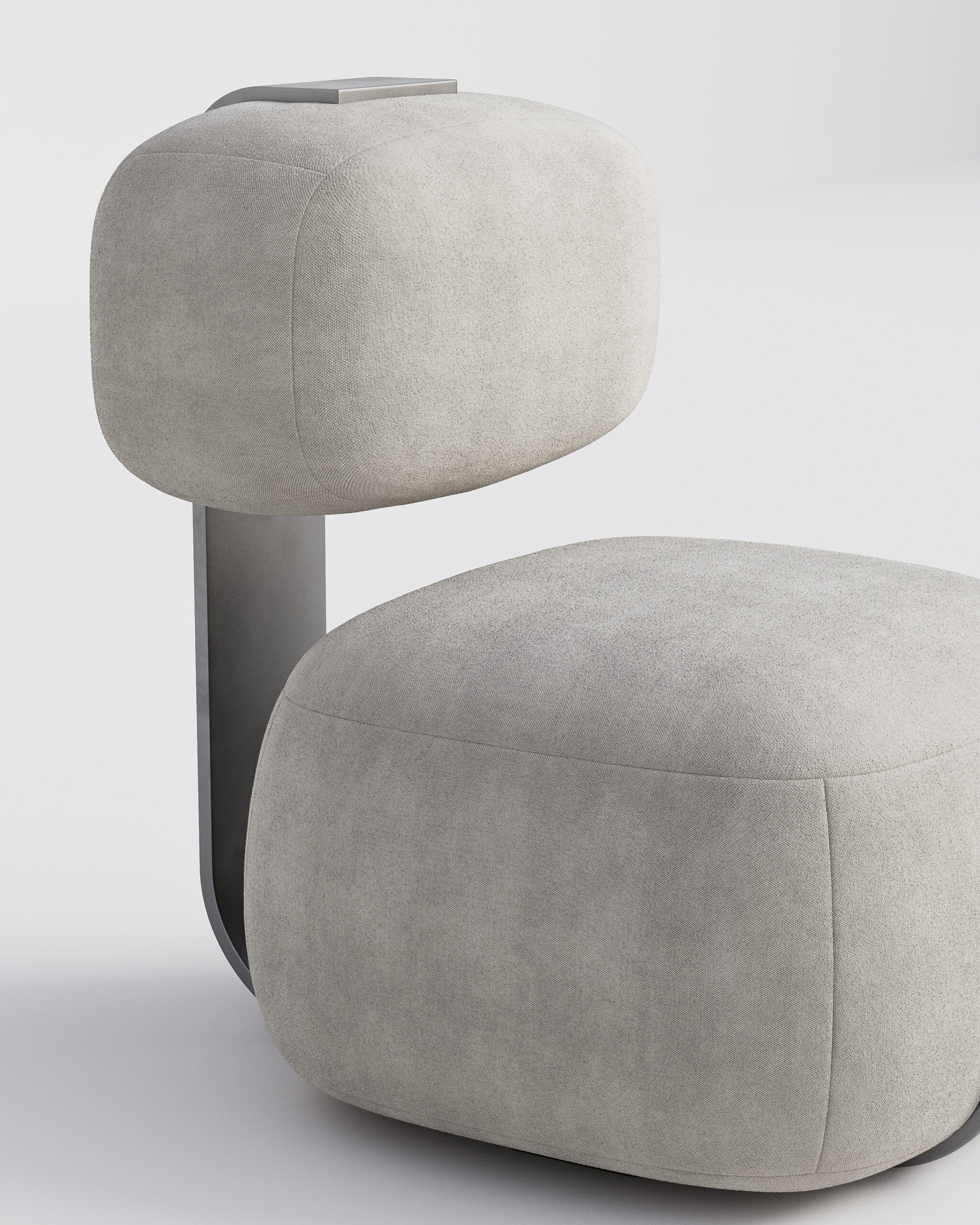 Tres fuerzas dialogan en equilibrio: asiento, espaldar y estructura. 3 Elementos nace de la idea de la unión, de cómo partes distintas pueden coexistir sin perder su identidad. Dos volúmenes tapizados —asiento y respaldo— flotan visualmente, conectados por una lámina metálica que actúa como gesto estructural y trazo continuo.